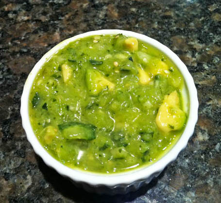 Never mind tortilla chips, I could eat this stuff with a spoon. You can also use this as a salad dressing too. The tasty blend of cucumbers, tomatillos, avocado and peppers make this a refreshing summer salsa.