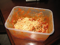Does this picture look familiar? You make a ton of spaghetti, put the leftovers in some tubberware and you’re left with this. When you’re ready to clean it up, wash with soap and COLD water. This will release the staining color. Then wash with soap and warm water. Guess what? I tried it out and it does work.